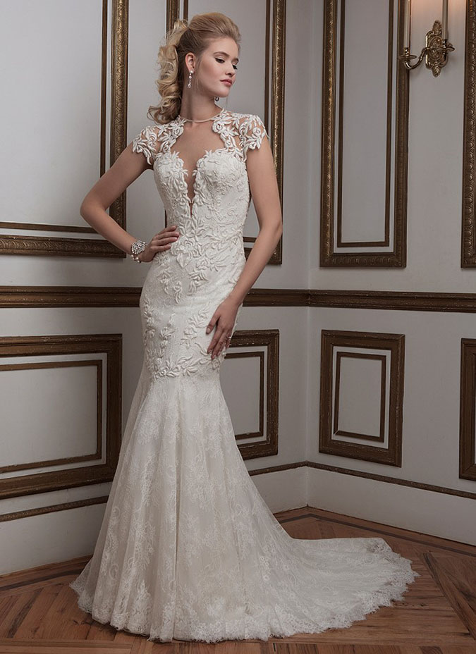 Stretchy and lightweight, jersey gives an exclusive look for brides who are looking for the sheath style. It is suitable for summer weddings but can be an option on a chillier day also.