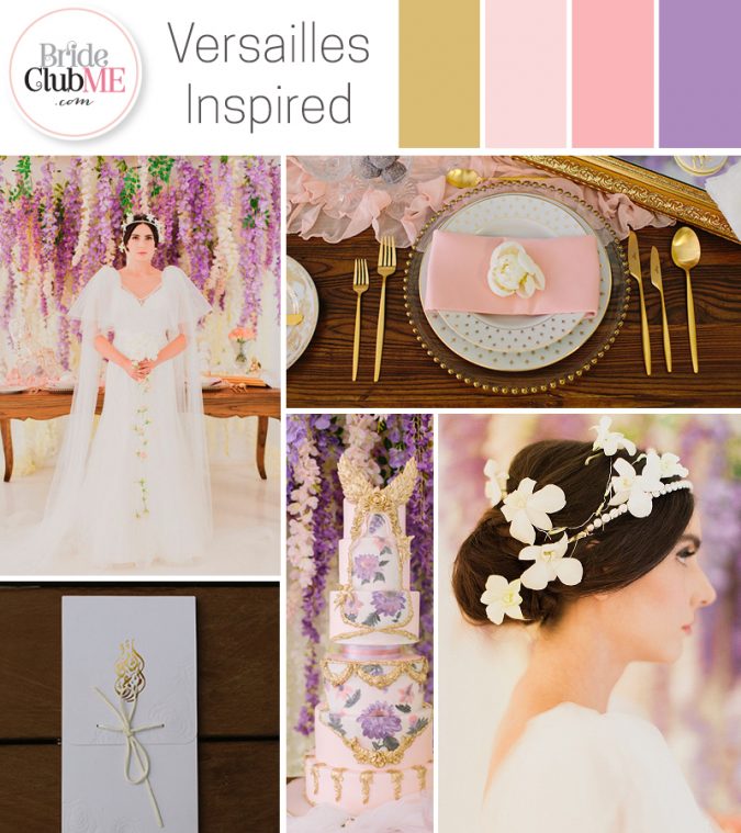 Today’s colour scheme takes us back to the Versailles-Inspired Romantic Styled Shoot that BCME organised in collaboration with our vendors Cloud 9 Weddings & Events towards the end of 2015. Inspired by the gardens of Versailles, this pretty and opulent moodboard features purples, pinks and gold, all of which can be easily incorporated into your wedding décor.