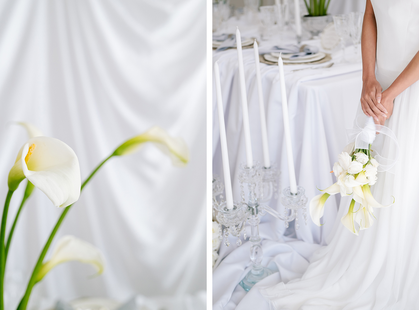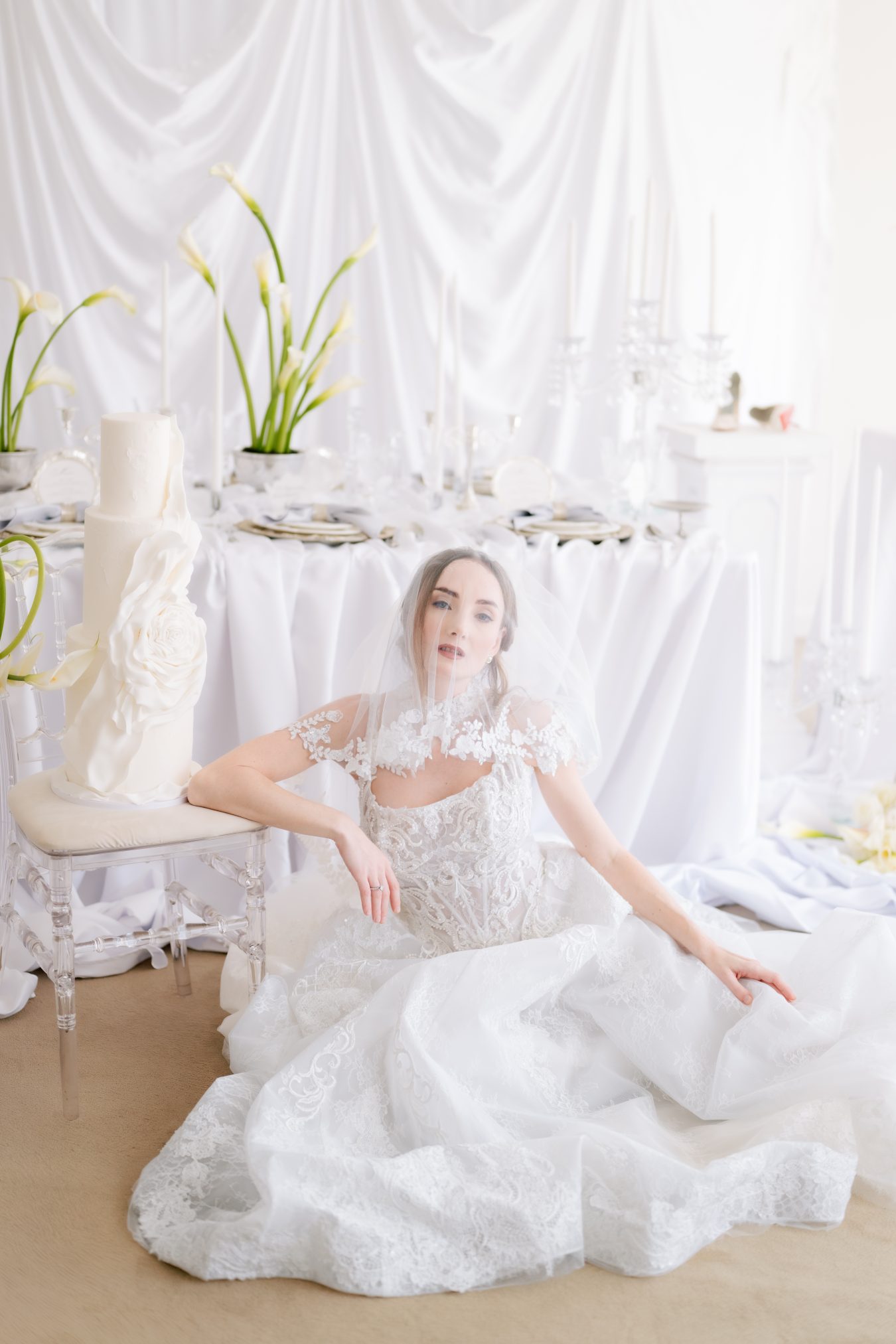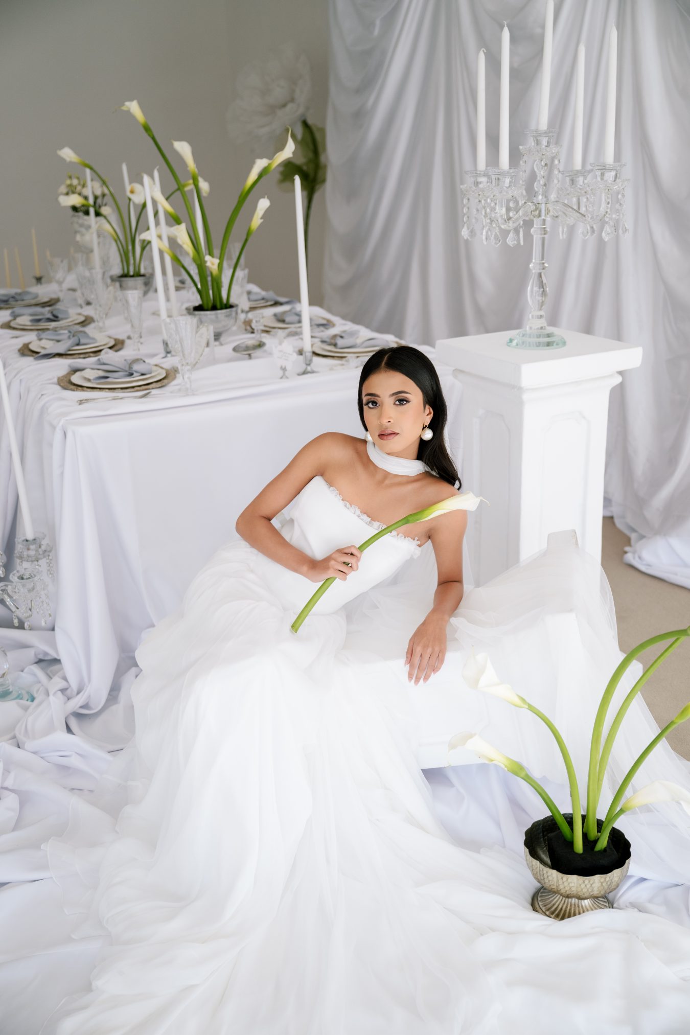This styled shoot began with a simple yet powerful visual: falling calla lilies. Their natural elegance and sculptural form set the tone for a wedding concept rooted in softness, femininity, and quiet luxury.