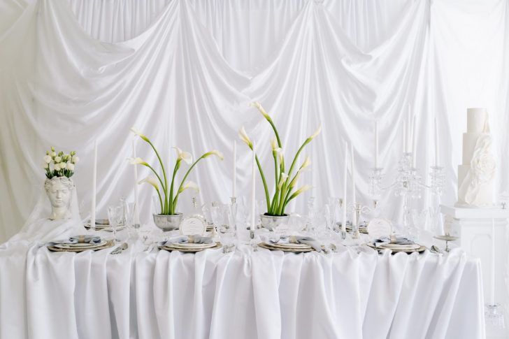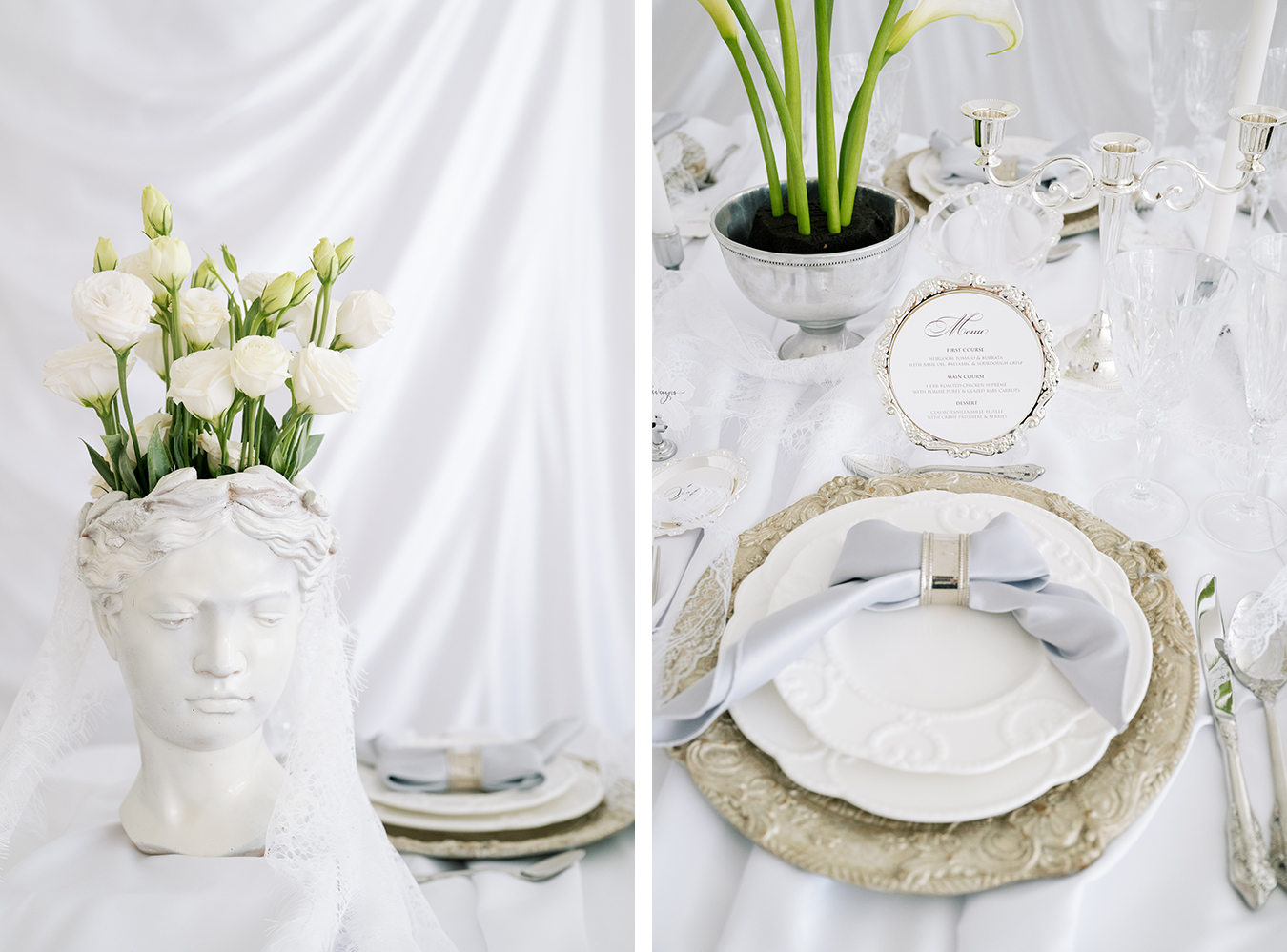 Draping was used intentionally across both the table and backdrop, adding movement and softness to the space. Subtle nods to classical art appeared through sculptural elements, while scattered florals introduced an organic, almost undone beauty—perfectly imperfect and deeply romantic.