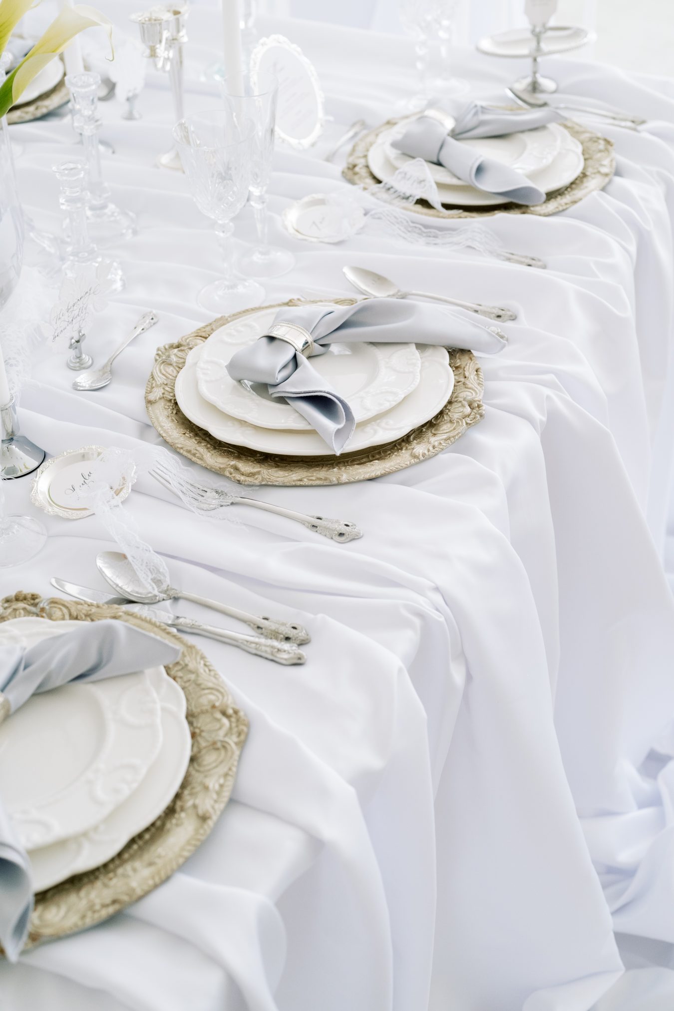 Vintage charger plates, ornate silverware, and crystal glassware introduced a sense of heritage and weight, while soft grey textiles and delicate finishes brought lightness and balance. The interplay of textures created a table that felt collected, nuanced, and rich in character, rather than overly styled.