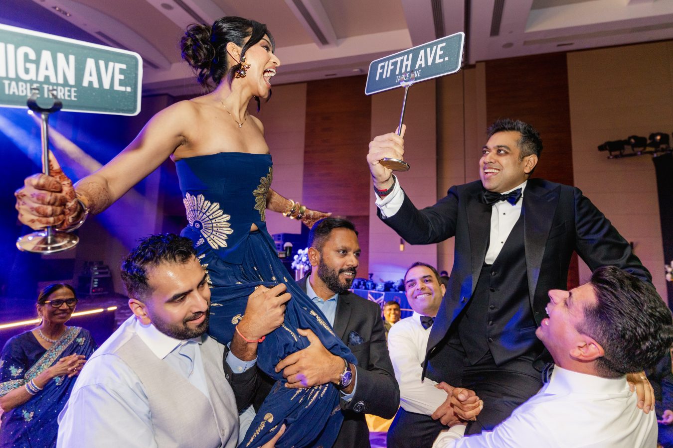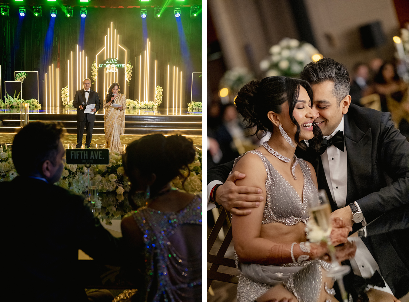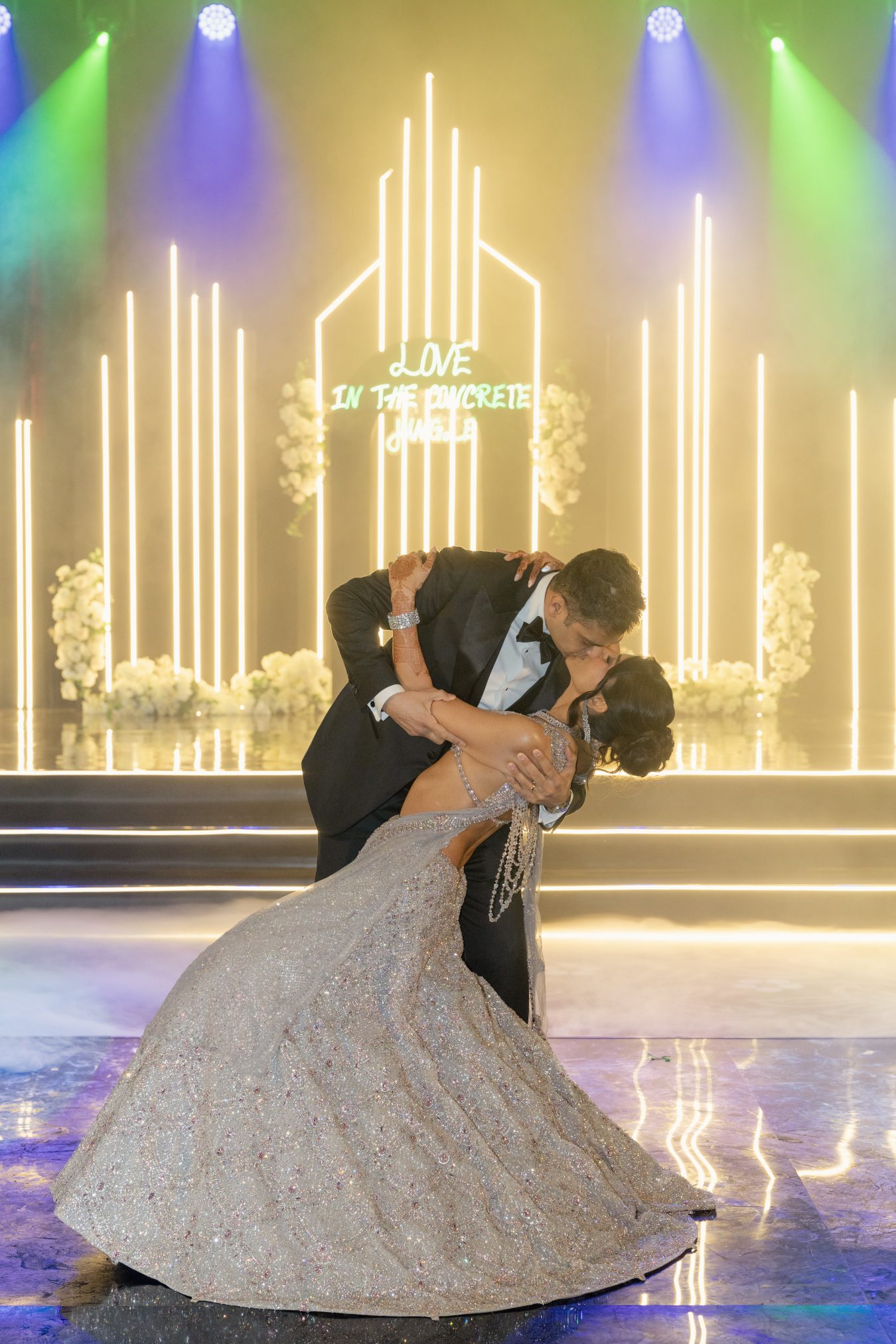 The Grand Reception was a striking shift in mood, metropolitan, fashion-forward, and unapologetically bold. Inspired by a night in the city, the décor drew from US street signs, urban skylines, skyscraper silhouettes, and modern city lights, layered with a jungle disco twist that brought in texture, drama, and energy.
