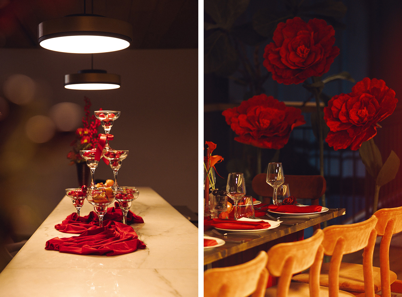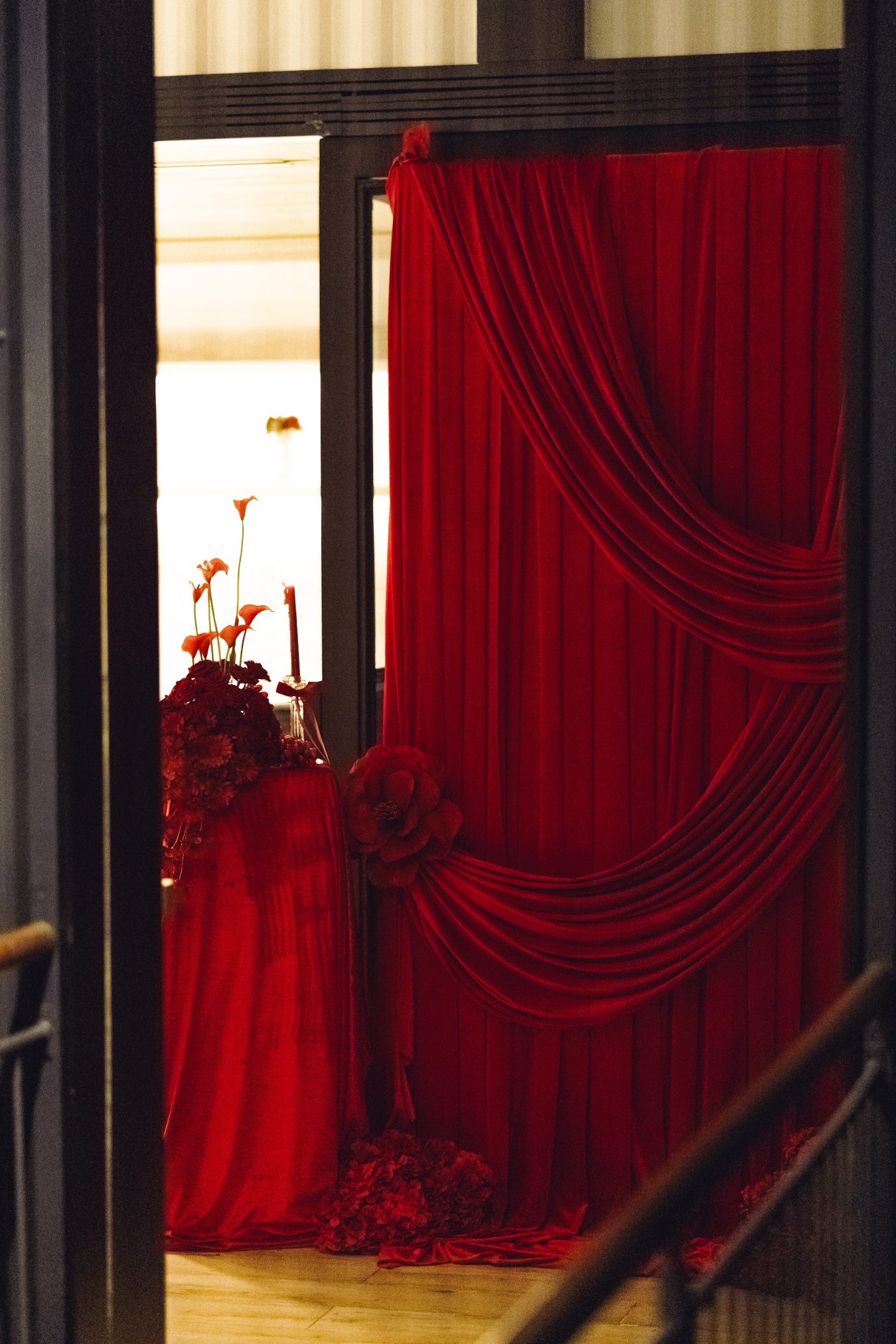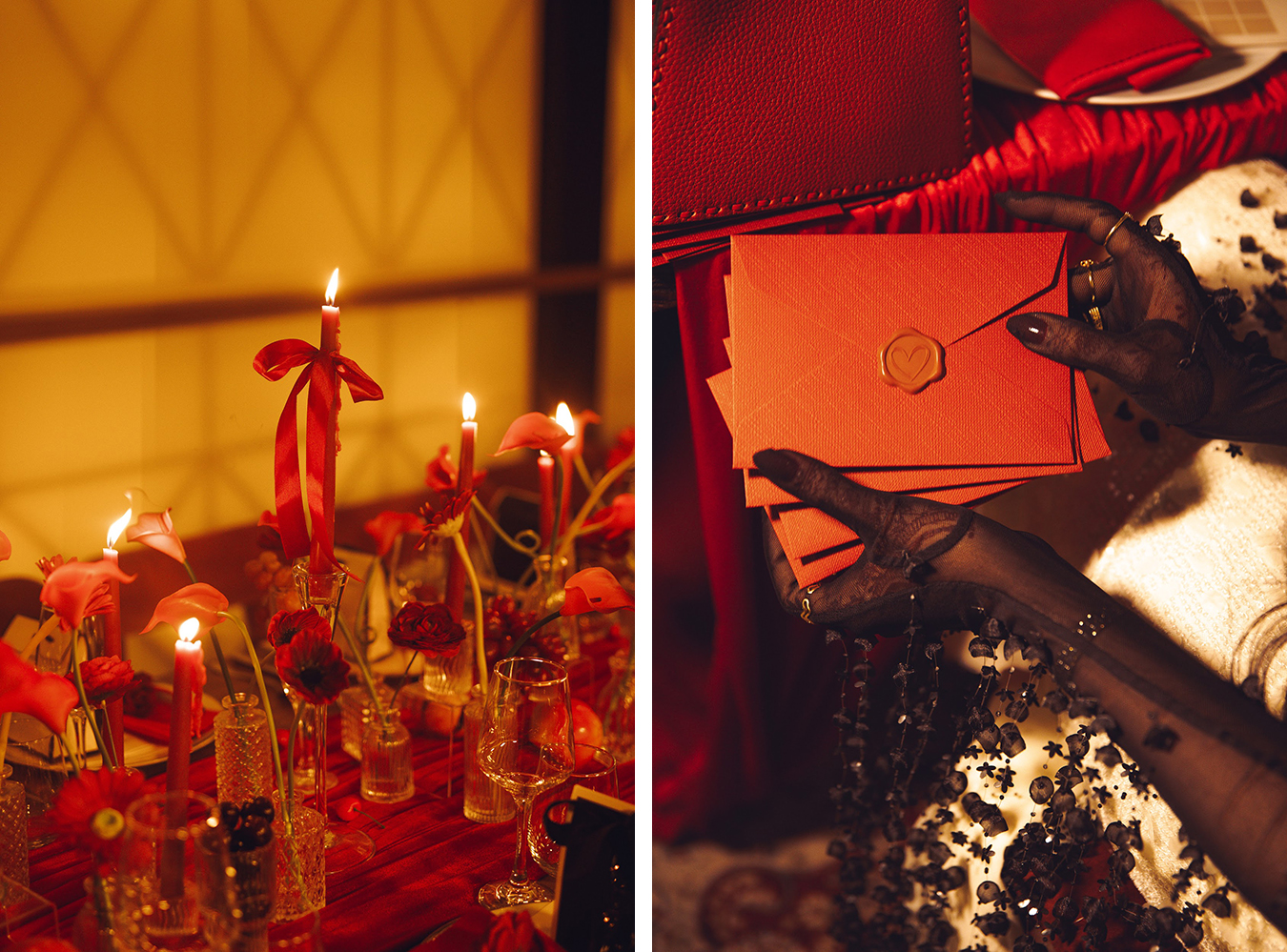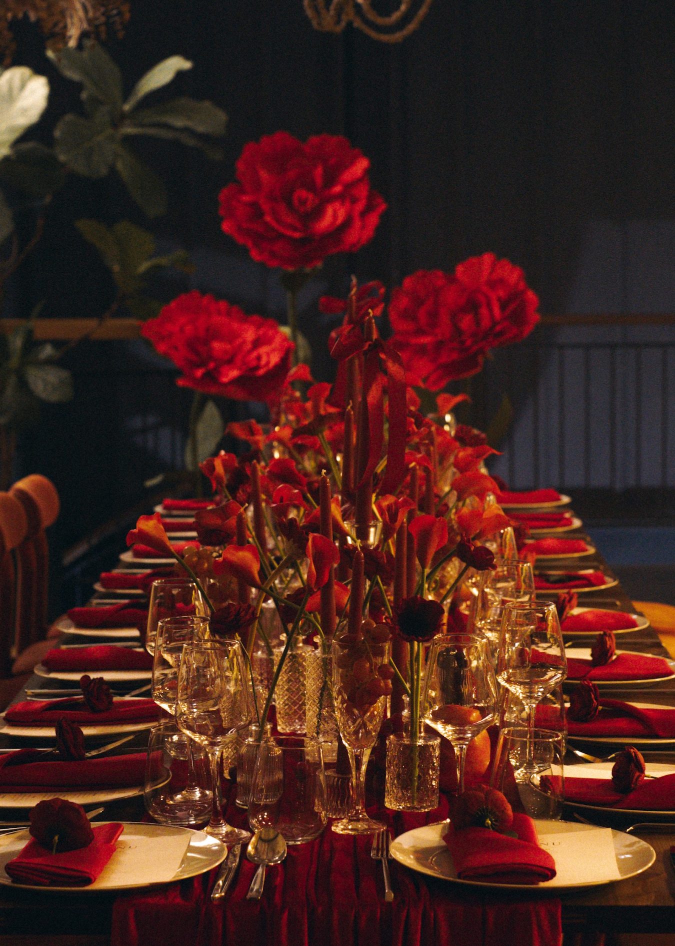 Born from Marzia’s vision of an unapologetic Mob Wife dinner shared only with her closest girls, the bridal shower embraced deep-crimson luxury and quiet feminine power. Blood-red roses spilled dramatically across the table, velvet textures added depth, and candle flames flickered softly, casting an unmistakable late-night glow.