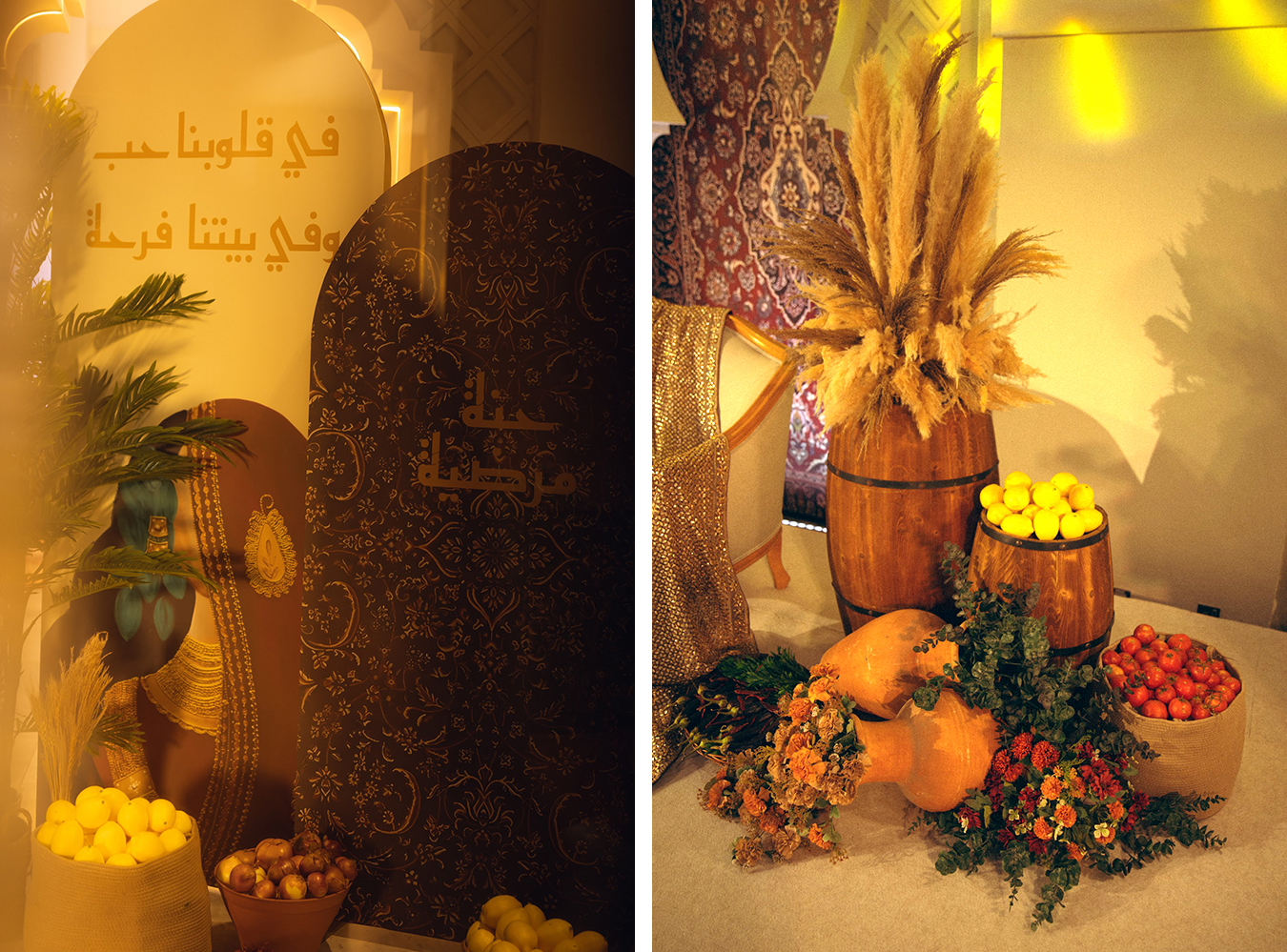 Arabesqué Weddings created this event as a living tapestry of South Asian soul and authentic Emirati heritage, celebrating cultural unity over predictable styling. Under the stunning glass skylight, the décor embraced a bazaar-inspired, sensory-rich world with spices, dried limes, earthy vegetables, copper tones, and woven textures forming an atmosphere that felt warm, intriguing, and refreshingly different.