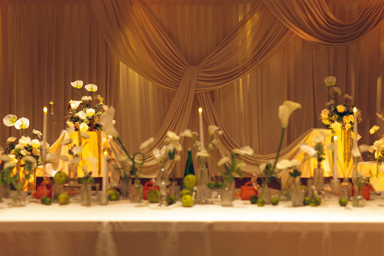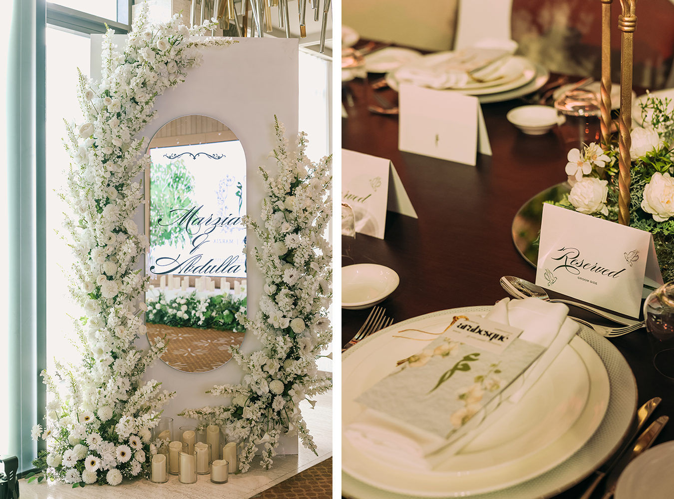 The grand finale, conceptualised by Arabesqué Weddings, unfolded inside the Mandarin Ballroom, transformed into a regal and timeless reception space. The styling anchored itself in rich traditional greens, balanced with refined neutrals and subtle metallic accents for a design that felt both classic and striking.
