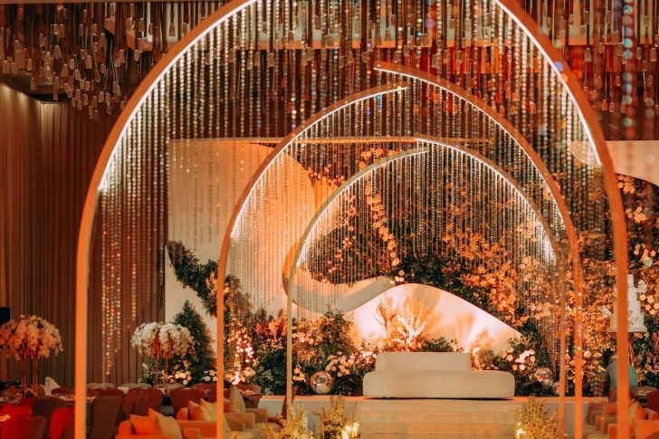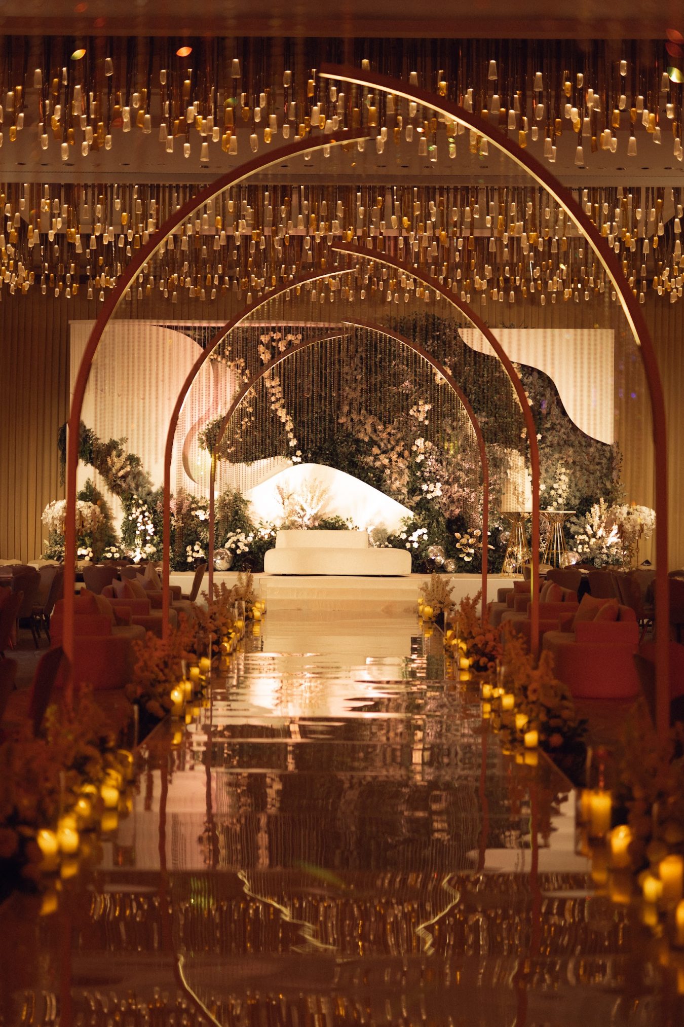 A custom-built stage and sculpted arches rose in sweeping curves that felt architectural yet soft, powerful yet graceful. Sensory touchpoints like finjan customisation stations and the aroma of freshly poured Arabic coffee were woven throughout the reception, grounding the evening in heritage and heart.