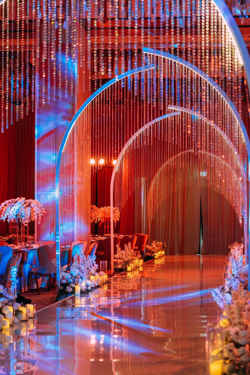 The aisle stretched the full length of the ballroom, holding space for anticipation before the bride’s entrance delivered a moment that was breathtaking, cinematic, and unforgettable.